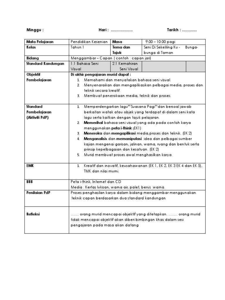 . 1012018 Mata Pelajaran Pendidikan Kesenian Masa 1000 1100 PAGI Kelas 1 RAJIN Tema dan Tajuk Seni Di Sekeliling Ku - Bunga-bunga di Taman Bidang Menggambar Capan contoh. 41 Mata Pelajaran Hari. Rancangan Pengajaran Harian Pendidikan Kesenian PSV Tahun 1 2018 Minggu.