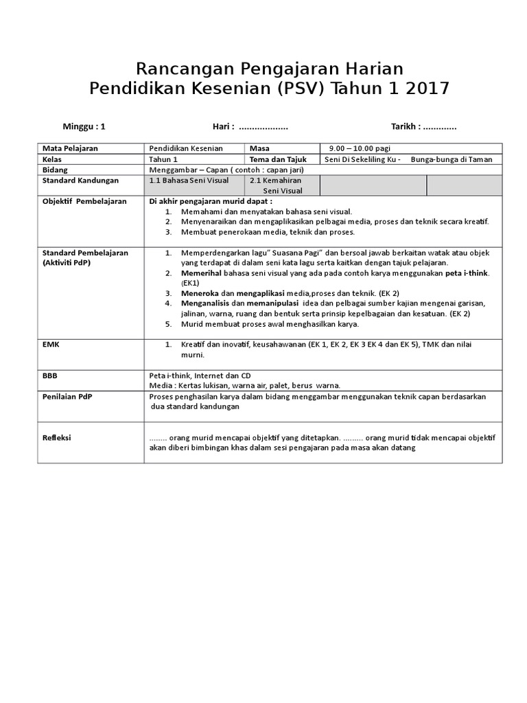 Rancangan Pengajaran Harian Pendidikan Kesenian PSV Tahun 1 2020 Minggu. Pendidikan Kesenian PSV Tahun 1 2017. Berikut merupakan RPT bagi mata pelajaran Pendidikan kesenian Tahun 1 2017.